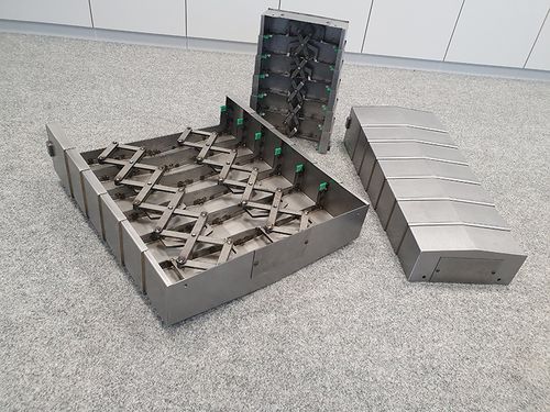 我们设计和生产由防腐蚀钢板或不锈钢制成的伸缩式钢板防护罩,可根据不同的机床理念要求量身定做。 除了四种标准形状(平面、斜面、屋顶形状和扁平化屋顶形状)外,当有困难的导向几何形状或有限的空间条件需要时,我们还可以设计出完全个性化的解决方案。 伸缩式钢板防护罩 导向设计 形状和尺寸